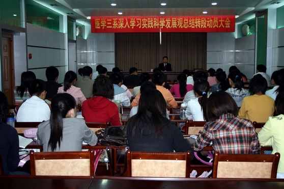 5月20日上午,医学三系在图书馆十楼视频会议室,召开深入学习实践科学发展观活动转阶段动员大会。校领导李朝品副院长出席会议,并作动员讲话。医学三系总支副书记陈阳主持会议,全系教工党员、学生党员、入党积极分子参加会议。