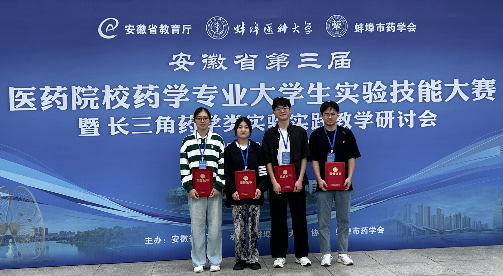 9月27日至29日,由安徽省教育厅主办、蚌埠医科大学承办、蚌埠市药学会协办的第三届安徽省医药院校药学专业大学生实验技能大赛在蚌埠举行。我校选拔的4名选手凭借扎实的专业知识、精湛的实验技能,取得一等奖1人、二等奖2人、三等奖1人的优异成绩。
