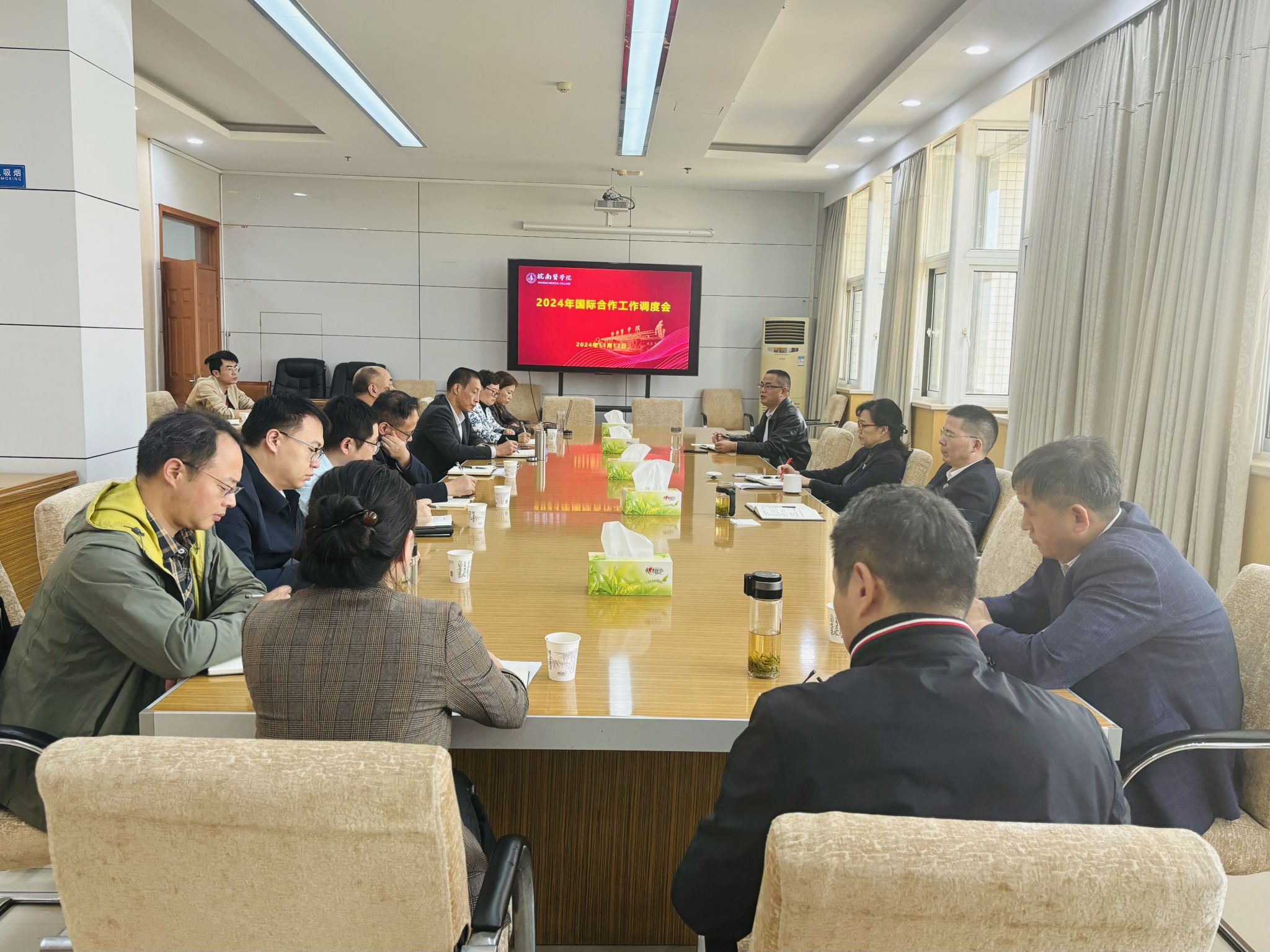 国合处、教务处、护理学院、直属附属医院等相关部门和单位负责人参加会议。(邱昊/文 蒯文婷/图)