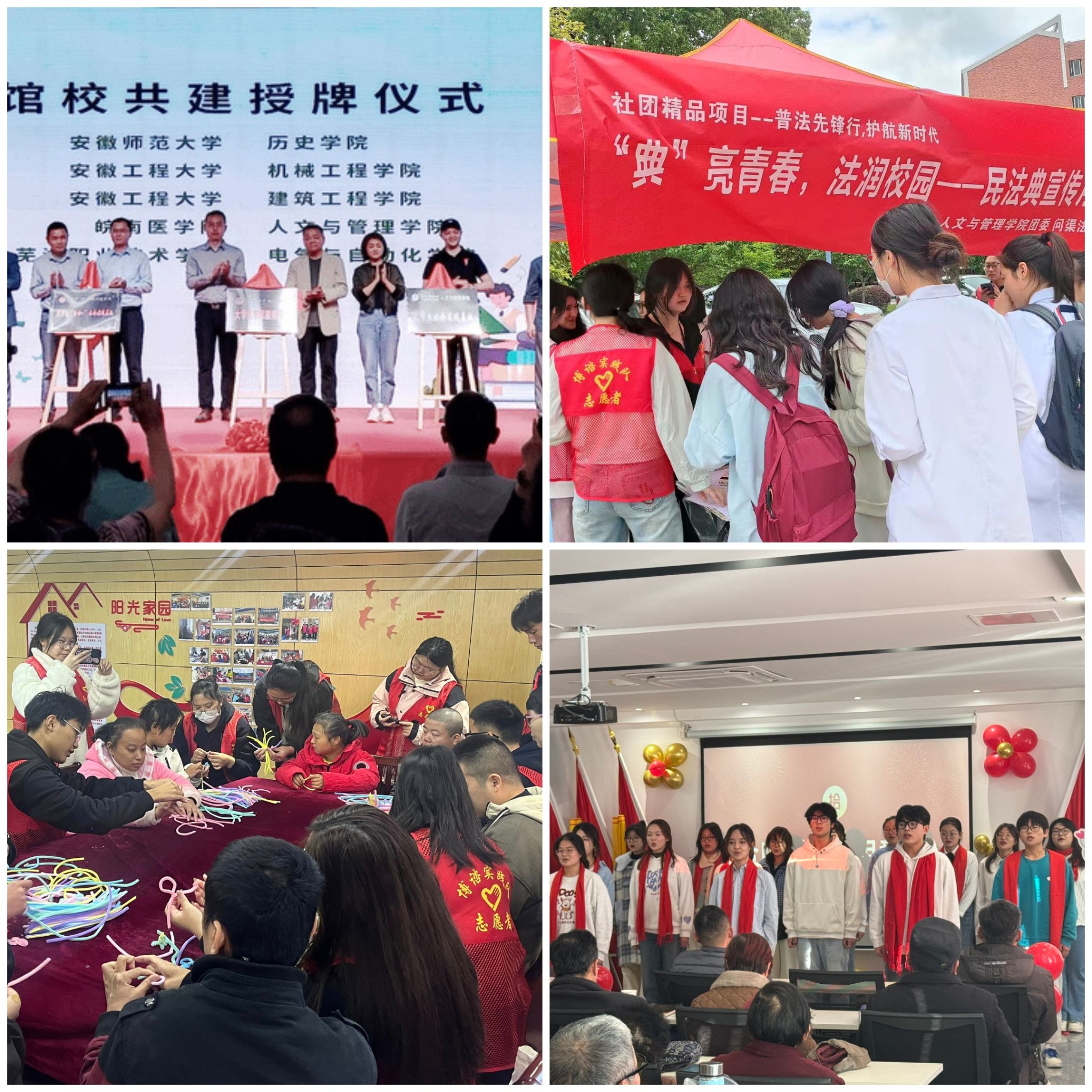 立足专业优势,以“博谘”志愿服务队为核心引擎,通过青春法治行、心梦、筑梦青春、幸福葆四大特色分队深耕社会服务领域,活动获中国青年报、安徽新闻网、芜湖新闻网等10余家主流媒体50余次专题报道,其中 "筑梦青春·致敬消防"项目入围全省十佳消防志愿服务项目评选(全省仅20席)。通过"专业赋能+实践育人"双轮驱动,志愿服务队每年平均开展活动90余场次,累计服务时长逾22700小时,惠及群众8600余人次。