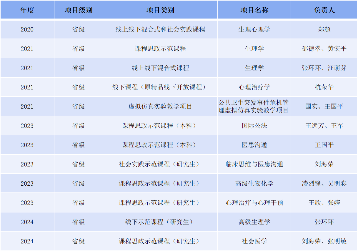 课程建设创新实践。学院深度对接"健康中国"战略需求,系统构建"医学+"课程体系。聚焦复合型人才培养目标,建设医学与法学交叉课程群(《卫生法学》《医事法》等)、医学与管理学融合课程群(《医院管理学》《卫生政策学》等)、医学与心理学贯通课程群(《医学心理学》《心理治疗学》等)、医学与保险学交叉课程群《医疗保险学》),形成特色鲜明的跨学科课程矩阵。通过跨学科教学研讨,提升课程内容与医疗卫生行业发展的契合度。“十四五”期间,获批《心理治疗学》《生理心理学》《社会医学》《国际公法》等12门省级一流建设课程,主编/副主编《医学心理学》等国家级规划教材8部、省级规划教材3部,参与编写行业特色教材13部,构建起"精品课程-优质教材-实践案例"三位一体的教学资源体系。