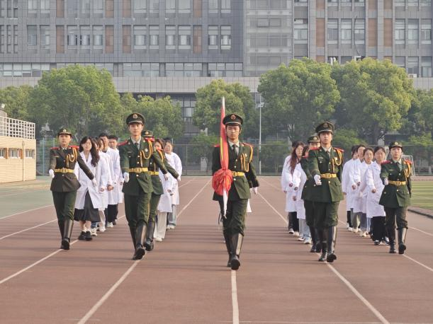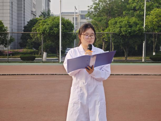 升旗仪式后,青马学员代表周和悦作“青马学员说”主题分享,鼓励青年学子积极投身志愿服务活动,于点滴小事中彰显爱心善意,于平凡举动里汇聚强大力量。2023级杨坤同学分享捐献造血干细胞经历,以"生命接力"的实际行动生动诠释了"奉献、友爱、互助、进步"的志愿精神,展现了新时代青年勇担社会责任、无私奉献的高尚品格。在学生代表何凡的带领下,全体学生高举右拳,庄严地重温医学生誓言。宣誓完毕后,学生代表韦佳悦和吴鑫深情朗诵,向革命先辈们致敬,激励广大同学向先辈们学习,在服务社会中书写青春华章。最后,活动在全体参会人员齐声高唱校歌中圆满结束。
