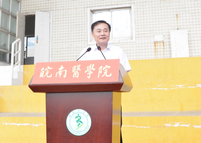 党委副书记、院长廖圣宝发表了热情洋溢的讲话。他介绍了学校发展历程、办学特色和办学成绩,表示学校自1958年建校以来,始终坚持立德树人根本任务,始终与国家发展同向同行,已形成集全日制本科教育、研究生教育、成人高等教育、留学生教育于一体的人才培养体系,涌现出一批诲人不倦的知名教授、大师和一大批爱岗敬业的优秀教师,用行动诠释了“精医、尚德、求实、自强”的校训,铸就了“艰苦创业、求实自强、奉献社会”的皖医精神。作为新“皖医人”,同学们将与学校同发展、共成长,将成为学校“大学梦”的圆梦人和见证者,为皖医增添新的力量,带来新的希望。