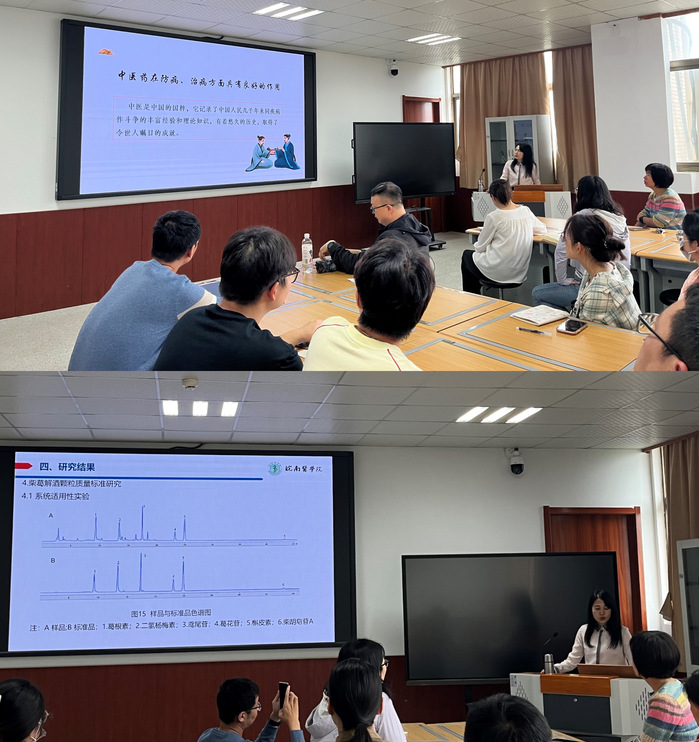 王存琴教授以“中药复方的作用机制及质量标准研究”为题作学术报告。她以自己的研究工作“柴葛解酒颗粒”及“定眩颗粒”的作用机制及质量标准研究为例展开阐述,介绍了柴葛解酒颗粒对酒精性肝损伤的保护作用及质量标准研究和定眩颗粒对豚鼠膜迷路积水的药效学作用及质量标准研究,深入探讨了中药复方的安全性评价、药效作用和机制及质量控制标准研究等内容。报告结束后,王存琴教授和参会师生就报告相关内容进行了热烈交流。整场报告内容丰富,层层深入,通俗易懂,参会师生受益良多。