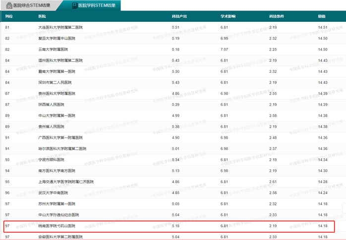 在五年总科技量值(ASTEM)排名榜单上,烧伤外科学排名全国第12名,神经外科学排名全国第32名,皮肤病学排名全国第42名,麻醉学排名全国第53名,变态反应学排名全国第63名,危重症医学排名全国第83名,急诊医学排名全国第98名。