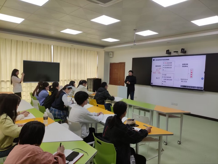 袁慧教授以“孟德尔随机研究在因果推断中的应用”为题作学术报告。报告主要介绍了孟德尔随机化在观察性研究中使用遗传变异作为工具变量来检测和量化因果关系,为传统的观察性流行病学研究提供新思路,为病因推断提供强有力的证据。报告过程中,袁教授与师生进行了热烈交流和讨论,对大家提出的问题作详细解答。