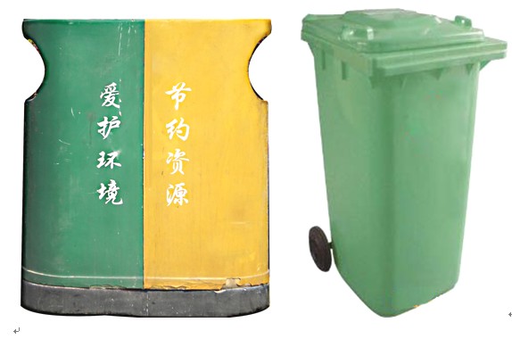 (2)玻璃钢双桶垃圾桶30个(见附图2),规格:83cm*70*38 材质:全新料。颜色按照样品图颜色。